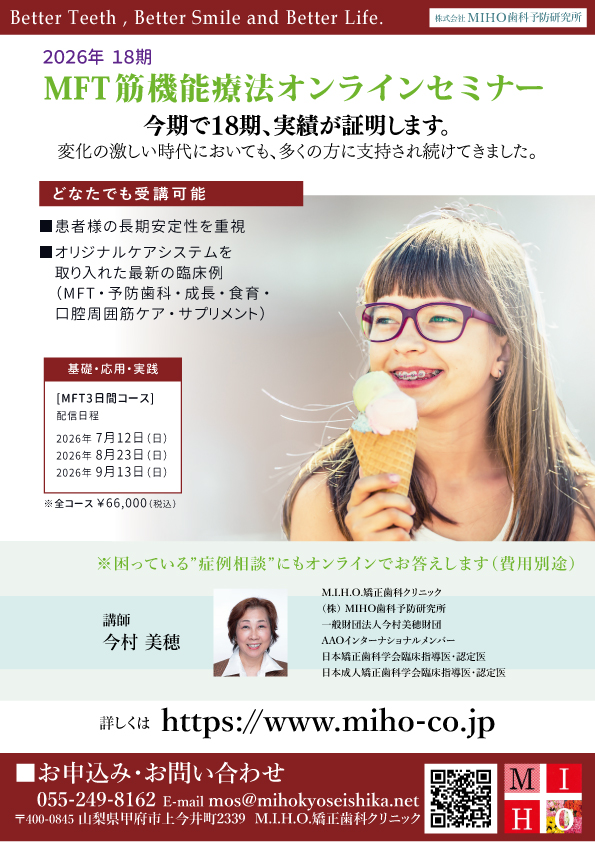 | 2026/7/12・8/23・9/13 | 2026年度18期MFT口腔筋機能療法セミナー ▼ リーフレットはこちら! | ■Web開催 |