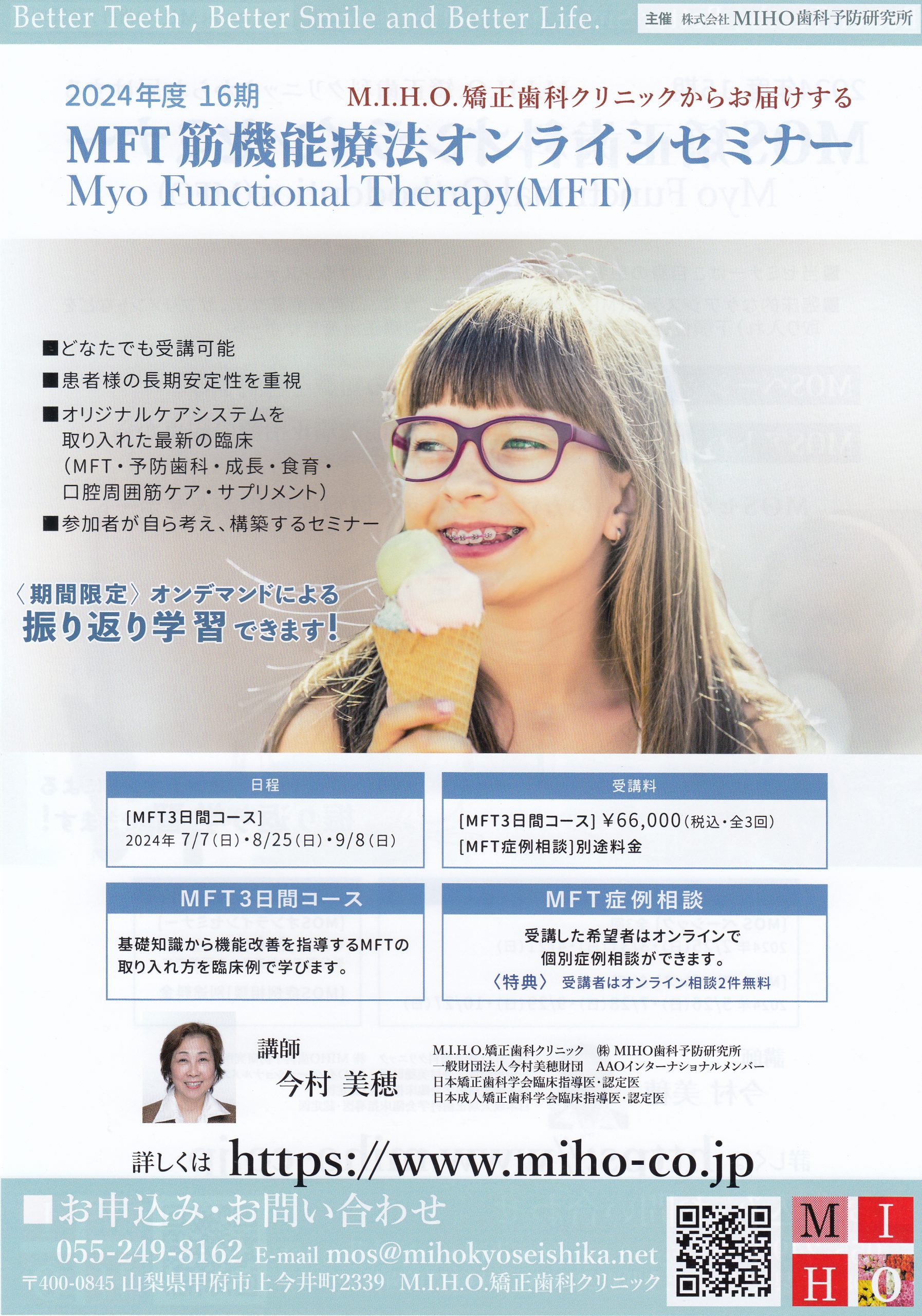 | 2024/2/25・3/31・4/21・5/26・7/28・9/29・10/27 | 2024年度16期MFT口腔筋機能療法セミナー ▼ リーフレットはこちら! | ■Web開催 |